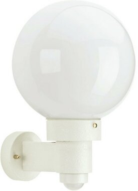 Albert-Wandleuchte 680257 - mit integriertem Bewegungsmelder - aus korrosionsbeständigem Aluminiumguß mit Kunststoffkugel weiß. Eingerichtet für 1 Glühlampe A 60 75W, Fassung E 27.Mit zusätzlichem Wandschild zum : weiß Schutzart IP 44 - Schutzklasse : d 250 x 370 x 285 mm