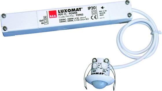 LUXOMAT® PD9 Mini-Bewegungsmelder für den Innenbereich, ein Kanal zum Schalten von Licht, 1C: Spannung: 110 - 240 V AC 50 / 60 Hz, Reichweite: max. Ø 10 m quer, empfohlene Montagehöhe: 2,5 m, Schaltleistung: 1000 W, Nachlaufzeit: 30 s - 30 min, Impuls, Einschaltschwelle: 10 - 2000 Lux.