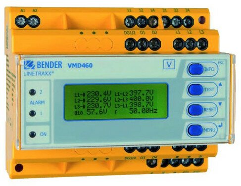 Netz- und Anlagenschutz (NA-Schutz) zur Überwachung der Netzeinspeisung von Erzeugungsanlagen für BHKWs, Wind- Wasserkraft und Photovoltaikanlagen nach VDE-AR-N 4105, BDEW-Richtlinie, CEI 0-21 und C10/11 . Externer Netz- und Anlagenschutz (NA-Schutz), der die Verbindung zwischen dem öffentlichen Netz und der Erzeugungsanlage bei Grenzwertverletzungen durch Ansteuern von Kuppelschaltern trennt. Befinden sich Spannungs- und Frequenzmesswerte außerhalb von normativ geforderten Schwellwerten, schalten die Relais des VMD460, Multifunktional einstellbar. Die aktuellen Messwerte werden permanent auf dem LC-Display angezeigt. Die zum Schalten der Relais führenden Messwerte werden gespeichert. Benötigt eine separate Versorgungsspannung.