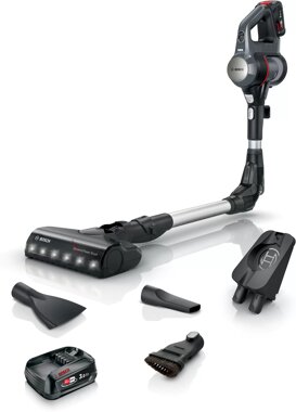 Bosch BBS712A. Produkttyp: 2-in-1-Stabstaubsauger, Staubbehälter Typ: Beutellos, Produktfarbe: Graphit. Reinigungsart: Trocken, Vakuum-Luftfilterung: Hygienefilter, Schmutztrennungsmethode: Filterung. Leistungskontrolle: Elektronisch, LED-Anzeigen: Akkustand. Energiequelle: Akku, Akku-/Batteriespannung: 18 V, Laufzeit: 80 min. Verpackungsbreite: 800 mm, Verpackungstiefe: 300 mm, Verpackungshöhe: 195 mm