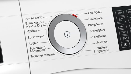- Spezialprogramme Waschen: Trommel reinigen (mit Erinnerungsfunktion), ExtraKurz 15', Spülen, Mix, MyTime, Schleudern/Abpumpen, weitere Programme über Home Connect, Sportswear