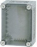 total isoliert, ohne Montageplatte, metrische Vorprägungen für die Leitungseinführung in allen Seitenwänden, durch Ausbrechen dieser Wände lassen sich großflächige Durchbrüche herstellen, Einschließlich Befestigungslaschen für Wandbefestigung, Verbindung der Gehäuse unter- bzw. nebeneinander mittels Keilverbindung