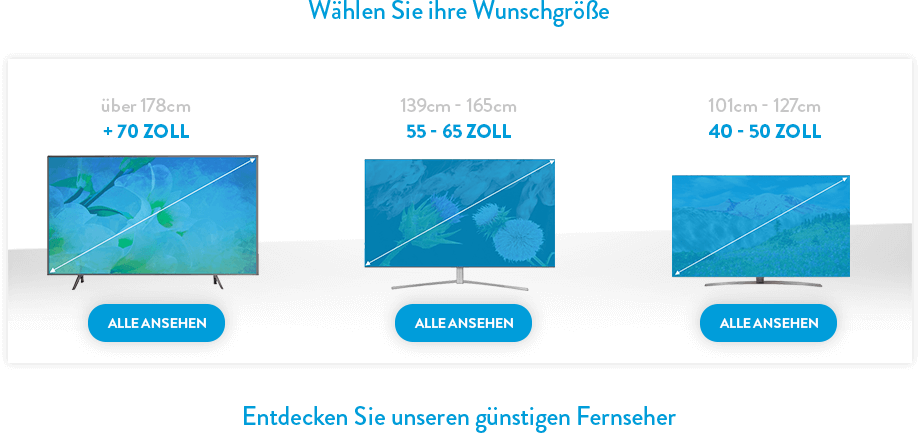 Die Werte der folgenden Tabelle beziehen sich auf 4K Ultra HD Fernseher.Diagonale in Zoll Diagonale in Zentimeter Maße (Höhe x Breite) Entfernung zum Sitz ca. 40 Zoll 102 cm 49,8 x 88,6 cm 1,5 m 50 Zoll 127 cm 62,3 x 110,7 cm 1,9 m 55 Zoll 140 cm 68,5 x 121,8 cm 2,1 m 65 Zoll 165 cm 80,9 x 143,9 cm 2,5 m 70 Zoll 178 cm 87,2 x 155 cm 2,7 m 75 Zoll 191 cm 93 x 166 cm 2,9 m Früher war auch der Sitzabstand ein wichtiges Kriterium bei der Wahl der Bildschirmgröße. Doch die modernen 4K Fernseher liefern gestochen scharfe Bilder bei jeder Distanz. Wenn Sie einen 65 Zoll Fernseher kaufen, sollten Sie jedoch nicht näher als 1,5 Meter vor dem Gerät sitzen. Sonst können Ihre Augen das Bild nicht gut erfassen.Ihr Budget ist begrenzt und Sie möchten einen gebrauchten Fernseher kaufen. Günstig muss der Preis sein? Dann bietet sich ein Full HD Fernseher an, allerdings sind diese Geräte durch ihre aussterbende Technologie nicht zukunftsorientiert.In diesem Fall können Sie die erforderliche Bildschirmgröße einfach mit folgender Formel berechnen: Teilen Sie die Distanz zwischen Sitzgelegenheit und Fernseher durch 2,5. Das ergibt die optimale Bildschirmdiagonale in Zentimetern. Das bedeutet beispielsweise, dass die optimale Distanz zu einem 40 Zoll TV mit Full HD rund 2,5 Meter beträgt. Heute können Sie jedoch problemlos viel näher an einem Fernseher mit 40 Zoll Bildschirmgröße oder an einem 50 Zoll Fernseher sitzen.Auflösung: (Fast) kein Thema mehr
