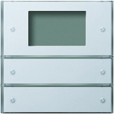 Flächenschalter Grafik-Display mit Hintergrundbeleuchtung und vielfältigen Anzeigemöglichkeiten (Temperatur, Uhrzeit, Datum, Alarm und Hinweistexte), mehrfarbige Status-LED (rot, grün, blau) über die ETS parametrierbar, zwei Status LED je Bedienfläche, Betriebs-LED weiß, Integrierter Temperatursensor zum Messen und Weiterleiten der lokalen Raumtemperatur, Montage auf Busankoppler 3 oder externer Fühler, Projektierung und Inbetriebnahme erfolgt ab ETS3.0d Patch A, Demontageschutz durch Verschraubung, neutrale Beschriftungsschilder im Lieferumfang