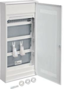 Multimedia, volta, APV, 4-reihig, mit geschlitzter Kunststofftür.Installationskleinverteiler Aufputz aus Kunststoff, nach DIN VDE 61439-3, geeignet zum Einsatz in Wohngebäuden nach DIN 18015 und zum Einbau von schutzisolierten VDI Komponenten. Schutzart IP30, Schutzklasse II schutzisoliert. Bestehend aus Kunststoffbodenplatte mit serienmäßigem Leitungsabfang, Lüftungstür aus Stahlblech mit geschlitztem Kunststoffeinsatz für ein besseres WLAN-Signal, pulverbeschichtet und eingebrannt und frontbündig mit innenliegenden handbedienbaren Scharnieren. Türverschluss mit frontbündiger Griffmulde und selbsttätig zurückklappendem Griff, Türanschlag rechts oder links. Oberer Anschlussraum: Patch Panel und DIN-Hutschiene isoliert aufgerastet zur Aufnahme von unterschiedlichen Kommunikationsmodulen, für den geforderten Funktionspotentialausgleich nach DIN EN 50310 (VDE 0800-2-310) sind am Patch Panel 2 Schraubbefestigungen vorhanden. Beschriftungsmöglichkeit mit beiliegendem Bezeichnungsstreifen zur Portbeschriftung. Vormontierte gelochte Montageplatten aus verzinktem Stahlblech mit 3,2 mm Lochung sind eingebaut. Ein Universalhaltebügel kann für die schraublose Befestigung von VDI-Komponenten direkt auf dem Lochblech eingehängt werden. Im unteren Anschlussraum ist eine 3-fach Schutzkontaktsteckdose (90° drehbar) montiert. Über eine Anschlussklemme sind die Steckdosen direkt anschließbar. Die Steckdosen sind mit einer beiliegenden Schutzkontaktabdeckung zur Einhaltung der Schutzklasse II bestückbar. Hinweis: Ein Überspannungsschutzmodul Typ 3 kann direkt angeschlossen werden (nicht enthalten).
