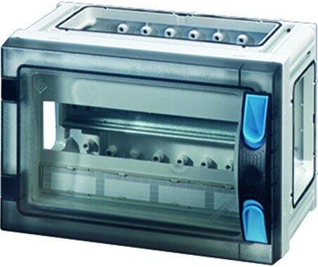 für Geräte bis 63 A, mit PE- und N-Klemmen, Türverschluss mit Handbetätigung, Verschlussplatten und Anbauflansche separat bestellen