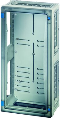 Gehäuse mit Tür für den Bau von Installationsverteilern bis 250 A für die Bedienung durch Laien nach IEC 61439-3. Offene Gehäusewände für die Kombination oder als Einzelgehäuse mit Verschlussplatten. Aus hochwertigem Polycarbonat, schutzisoliert. Schnelle Gehäuseverbindung durch Steckverbinder und integrierte Dichtungen. Große Wanddurchführungen für die elektrische Verbindung der Gehäuse untereinander. Kabeleinführung über Flansche. Wandbefestigung direkt am Gehäuse, über Außenlaschen oder mit Montageschienen. Zählergehäuse für Zähler mit Dreipunktbefestigung, inklusive 2 Zählerbefestigungen, transparenter Tür und Türverschluss mit Werkzeugbetätigung. Max. Einbautiefe 136 mm. Einsatz im ungemessenem Bereich nach Absprache mit örtlichem Netzbereiber. Die Plombiervorrichtung für die Türvorrichtung muss separat bestellt werden.