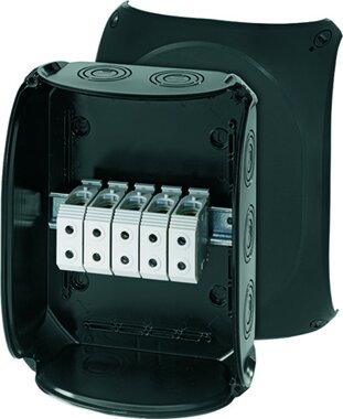 wetterfest für die ungeschützte Installation im Freien, aus schlagfestem, halogenfreiem Polycarbonat, glasfaserverstärkt, AKM gesondert bestellen, Bemessungsspannung AC 690 V, Kabeleinführungen über metrische Vorprägungen, Klemme mit 2 Klemmstellen je Pol