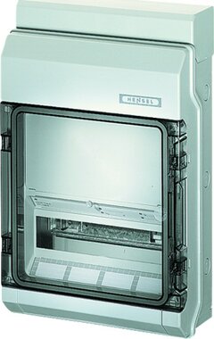 mit Raum für bedienungsabhängige Geräte, aus Polystyrol, geeignet für Innenräume und die geschützte Installation im Freien, Schutzart IP 65, zum Einbau von Geräten mit Schnappbefestigung auf DIN-Tragschiene, Hutprofil 35 mm, Bemessungsisolationsspannung AC 400 V, mit transparenter Tür, mit Abdeckstreifen für den Geräteausschnitt, mit Raum für bedienungsunabhängige Geräte und jeweils einer zusätzlichen DIN Tragschiene. 1 TE = 18 mm