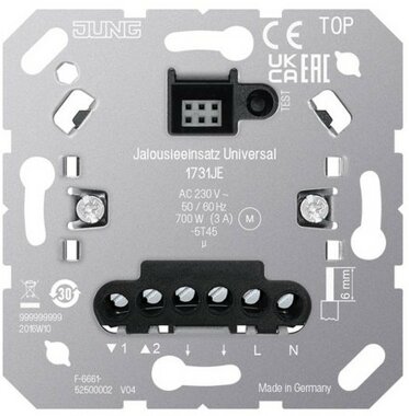 mit Nebenstelleneingang für Aufsätze JUNG HOME Art.-Nrn.: BT .. 17101 .., BT .. 17102 .. für Aufsätze eNet Art.-Nrn.: FM .. 1700 .., FM .. 1701 .. für Aufsätze LB-Management Art.-Nrn.: .. 1700 .., .. 1750 D .. für Aufsätze KNX RF Art.-Nrn.: .. 10911 ST RF .., .. 10921 ST RF .. Bestimmungsgemäßer Gebrauch Steuern elektrisch betriebener Jalousien, Rollläden und Markisen Automatische Zeitsteuerung über Aufsatz oder Nebenstelleneingänge Betrieb mit geeignetem Aufsatz Montage in Gerätedose mit Abmessungen nach DIN 49073 Produkteigenschaften Über Nebenstelleneingänge ist die Einbindung in Gruppen- oder Zentralsteuerungen möglich Automatische Steuerung über Timer Testbetrieb zur Funktionsprüfung Betrieb als Hauptstelle oder Nebenstelle Windalarm-Verriegelung über den Nebenstelleneingang Umpolfunktion der Ausgänge zur vereinfachten Inbetriebnahme Speicherung einer Lüftungsposition über den Aufsatz möglich Nennspannung: AC 230 V ~ Netzfrequenz: 50/60 Hz Umgebungstemperatur: ?5 ... +45 °C Kontaktart: µ Standby-Leistung: max. 0,2 W Laufzeit: ca. 120 s Anschlussleistung Motoren: 700 W Anschluss Anschlussart: Schraubklemmen eindrähtig: 1 x 0,5 ... 4,0 mm2 2 x 0,5 ... 2,5 mm2 feindrähtig ohne Aderendhülse: 1 x 0,5 ... 4,0 mm2 2 x 0,5 ... 2,5 mm2 feindrähtig mit Aderendhülse: 1 x 0,5 ... 4,0 mm22 x 0,5 ... 1,5 mm2