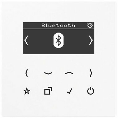 zur Montage in Einfach- oder Mehrfachrahmen und Aufputz-Kappen inklusive Netzteil Bestimmungsgemäßer Gebrauch DAB-Empfang im Frequenzbereich 174 MHz bis 240 MHz (VHF-Band III und Kanal 13) UKW-Empfang im Frequenzbereich 87,5 MHz bis 108 MHz (VHF-Band II) Wiedergabe und Steuerung der Musik von mobilen Geräten über Bluetooth® Montage auf Gerätedose mit Abmessungen nach DIN 49073 Tiefe der Gerätedose (Innenmaß): min. 40 mm Produkteigenschaften Digitalradio mit Display und Sensortasten Echtglasfront Stereoempfang Anschlussklemmen für zwei Lautsprecher Stereo-/Monoumschaltung Einfache Bedienung Integrierte Antenne für DAB+ und UKW Hohe Empfangsqualität Automatischer Sendersuchlauf Speicherung von 8 Favoriten DAB+ und 8 Favoriten UKW (bleiben nach Spannungsausfall erhalten) Speicherung von 8 Bluetooth®-Audioquellen Bluetooth®-Gerätename änderbar Einschalten mit letztem Sender Einschalten mit letzter Lautstärke Einschalten mit letzter Betriebsart (DAB+, UKW oder Bluetooth)® Anzeige von Senderinformationen, Uhrzeit und aktuellen Einstellungen Aktualisierung der Uhrzeit über RDS und DAB+ Display-Helligkeit einstellbar Nachtmodus Weckfunktion Sleep-Modus Ein-/Ausschalten über Nebenstelle Line-Out-Ausgang (AUX) zum Anschluss an externe Verstärker Optionale externe Wurfantenne Art.-Nr.: RAD-ANT Nebenstellenfunktion Über den Nebenstelleneingang kann das Radio gemeinsam mit der Beleuchtung geschaltet werden.