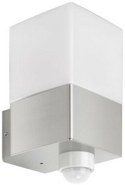 Edelstahl-Wandleuchte, IP44, Edelstahl, Diffusor Opalglas, mit 180° Bewegungsmelder, Reichweite max. 8 m, BxTxH 12x14,5x25 cm, 1xE27 max. 100 Watt, EEK: A++ bis E