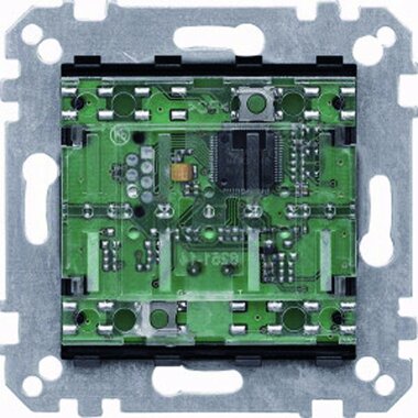 System M Tastermodul ohne Wippe, mit integriertem Busankoppler und programmierbarer Statusanzeige, wird über eine Busanschlussklemme mit der Busleitung verbunden, die Tasten können entweder als Tastenpaar (zweiflächig) oder als Einzeltasten (einflächig) parametriert werden
