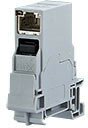 E-DAT Industry terminal rail TS35 field Anschlusseinheit mit RJ45-Modul oder -Kupplung zur Montage auf Tragschiene TH35 nach DIN EN 60715 die Baubreite von 1TE ermöglicht den Einbau von bis zu 12 Geräten in Standard-Elektroverteiler bei Einbau als Gerät der Schutzklasse I erfolgt der Potentialausgleich über eine schaltbare integrierte Potentialausgleichsfeder direkt über die Hutschiene, welche über entsprechende Kontaktierungsklemmen am Gebäudepotentialausgleich anzuschließen ist Steckrichtung senkrecht, 90° zur Tragschiene