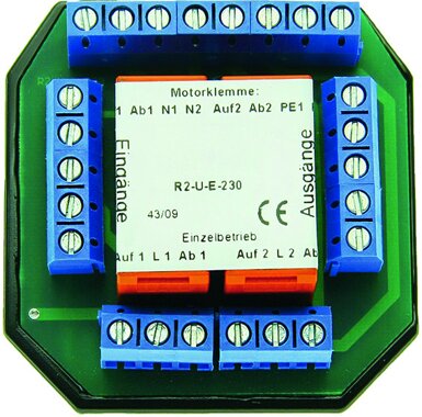 Relais zur Ansteuerung von Jalousie- und Rollladenmotoren mit mechanischen oder elektronischen Endschaltern. Wird dazu verwendet, um unerlaubtes parallel schalten von Jalousie oder Rollladenmotoren zu verhindern. An jedem Relais können bis zu zwei Motoren angeschlossen werden. Sollen mehrere Motoren betrieben werden, können mehrere Trennrelais gemäß Schaltplan verbunden werden. Spannungsversorgung: 230V AC, 50Hz. Schaltvermögen: 8/4A(AC1/cos phi 0,6). Stromaufnahme: 10mA