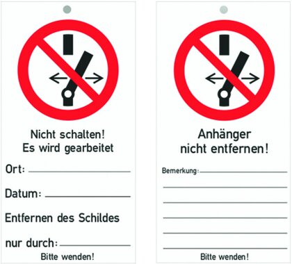 Wartungsanhänger aus PVC-Kunststoff. Zur Warnung an Maschinen, Geräten und Betriebsmitteln. Gekennzeichnet mit Symbol 'Nicht schalten'. Mit Kabelbinder zu befestigen. Beschriftbar mit PKMP Kabelmarker. Maße: 147x76 mm.