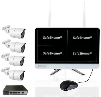 Safe2Home® POE + Funk Überwachungskamera Set Secure S1.1 mit 4x FULL HD POE Kameras für innen und außen (POE Kameras werden direkt über das Netzwerkkabel mit Strom versorgt. Sie benötigen keinen zusätzlichen Stromanschluss) Sichern Sie Ihr Haus mit den modernen und bezahlbaren Überwachungskameras von Safe2Home. Alles in dem Monitor enthalten: 3 TB Festplatte, Rekorder, Wiedergabe + Speicherung von bis zu 8 Full HD Cams. Erweiterbar mit Safe2Home Funk IP Kameras (pro Monitor max. 8 Kameras) POE + Funk 2,4 Ghz Video-Überwachungs-Sets von Safe2Home Großer 15 Zoll Monitor mit 3000 GB HDD (Festplatte) für Aufnahmen (hohe Auflösung 1280*1024) Gleichzeitige Aufnahme, Wiedergabe und USB Backup über den Safe2Home NVR All-in-One Monitor möglich 4 Full-HD POE Kameras mit IR-Strahlern für Nachtsicht und IP65 Zertifizierungen für den Außenbereich Reichweite der Kameras bis zu 300 Meter (Freies Feld) erweiterbar über WLAN Repeater 8 Kanal - bis zu 8 Cams können verbunden werden (POE oder Funk
