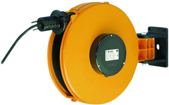 Voll-Kunststoff-Konstruktion, elektrisch schutzisoliert, Schutzart IP20, korrossionsbeständig, Spiralfederantrieb für ca. 30.000 Arbeitsspiele, mit schwerer Gummischlauchleitung, ohne Steckvorrichtungen, mit abschaltbarer Kabelarretierung, mit schwenkbarer Wandhalterung.