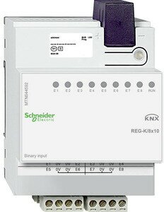 Schneider Electric KNX. Zum Anschluss von 8 konventionellen Tastern oder potentialfreien Kontakten an KNX. Erzeugt intern eine galvanisch vom Bus getrennte Signalspannung SELV. Mit integriertem Busankoppler und steckbaren Schraubklemmen. Je Eingang wird der Eingangsspannungspegel mit einer gelben LED angezeigt. Eine grüne LED zeigt nach dem Laden der Applikation die Betriebsbereitschaft an. Für die Montage auf Hutschienen TH35 nach EN 60715. Der Busanschluss erfolgt über eine Busanschlussklemme. Eingänge: 8. Kontaktspannung: max 10 V, getaktet. Kontaktstrom: max ca 2 mA, pulsförmig. Leitungslänge: max 50 m, Gerätebreite: 4 TE entspricht ca 70 mm. Lieferumfang: Mit Busanschlussklemme und Leitungsabdeckung.