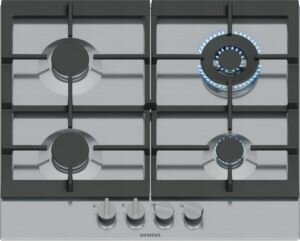 Edelstahl-Gaskochfeld mit stepFlame-Technologie zur präzisen Steuerung der Flamme, mit abnehmbaren Schwertknebeln und durchgehenden Topfträgern für eine mühelose Reinigung.