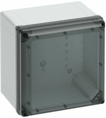 Leergehäuse-Industrie Qualität, geeignet für die Installation in rauen Umgebungen und im ungeschützten Außenbereich, Kasten: glasfaserverstärktes Polycarbonat, grau, ähnlich RAL 7035, Deckel: Polycarbonat, mit transparentem DeckelAbmessungen: 300 x 300 x 226mm