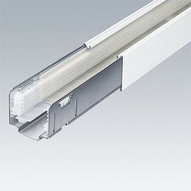 Tragschieneneinheiten aus rollgeformtem Stahlblech, mit weißem Polyesterlack pulverbeschichtet. 5 Netzleitungen (5 x 2,5 mm²/16 A) 2 x 2 Leiter (4 x 1,5 mm²/10 A) zur Integration von Notlicht über zwei unabhängig isolierte Stromkreise, und 2 Steuerleitungen (2 x 1,5 mm²/10 A). Werkzeugfreier Anschluss mit dem Stromzuführungssatz. Abmessungen: 2018 x 60 x 58 mm Gewicht: 3,7 kg