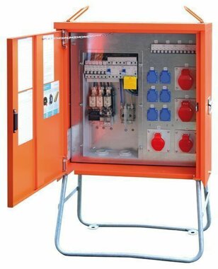 WALTHER Verteilerschrank Anschlussleistung: 44kVA nach IEC61439-4 Gehäuse (H06) aus elektrolytisch-verzinktem Stahlblech mit schwermetallfreier Kunststoff-Lackierung Farbe: RAL 2004 -reinorange- mit Einfachtür, Federfallriegel für Vorhängeschloss und Griffmulde mit Kranösen und seitlichen Tragegriffen inkl. feuerverzinktem Untergestell mit Ösen für Erdnägel Einbauten bis einschließlich RCD-Schutzschalter im Isolierstoffgehäuse Schutzart: IP 44 Größe ca.: 739 x 669 x 360mm / H-B-T + Untergestell-Höhe ca.: 323mm Anschluss: 1 Leistungsschalter 3P 63A mit thermisch-magnetischem Auslöser mit Rahmenklemmen 10-50 mm2 Abgang / Absicherung: 1 RCD-Schutzschalter 4P 63A/30mA -B- 2 CEE-Anbaudosen 32A 5P 400V 6h mit je 1 Leitungsschutzschalter (MCB) 3P 32A -C- 2 CEE-Anbaudosen 16A 5P 400V 6h mit je 1 Leitungsschutzschalter (MCB) 3P 16A -C- 1 RCD-Schutzschalter 4P 40A/30mA -A- 6 Schutzkontaktsteckdosen 16A 2P 230V mit je 1 Leitungsschutzschalter (MCB) 1P 16A -C-