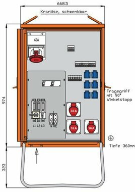 WALTHER Verteilerschrank Anschlussleistung: 55kVA nach IEC61439-4 Gehäuse (H08) aus elektrolytisch-verzinktem Stahlblech mit schwermetallfreier Kunststoff-Lackierung Farbe: RAL 2004 -reinorange- mit Einfachtür, Federfallriegel für Vorhängeschloss und Griffmulde mit Kranösen und seitlichen Tragegriffen inkl. feuerverzinktem Untergestell mit Ösen für Erdnägel Einbauten bis einschließlich RCD-Schutzschalter im Isolierstoffgehäuse Schutzart: IP 44 Größe ca.: 974 x 669 x 360mm / H-B-T + Untergestell-Höhe ca.: 323mm Anschluss: 1 Leistungsschalter 3P 80A mit thermisch-magnetischem Auslöser mit Rahmenklemmen 10-50 mm² Abgang / Absicherung: 1 RCD-Schutzschalter 4P 63A/30mA -B- mit Leitungsschutzschalter (MCB) 3P 63A -D- 1 CEE-Anbaudose 63A 5P 400V 6h ohne Vorsicherung -direkt ab RCD- 1 CEE-Anbaudose 32A 5P 400V 6h mit Leitungsschutzschalter (MCB) 3P 32A -C- 2 CEE-Anbaudosen 16A 5P 400V 6h mit je 1 Leitungsschutzschalter (MCB) 3P 16A -C- 1 RCD-Schutzschalter 4P 40A/30mA -A- 6 Schutzkontaktsteckdosen 16A 2P 230V mit je 1 Leitungsschutzschalter (MCB) 1P 16A -C-