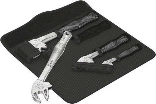 6004 Joker 4 Set 1 Selbstjustierender Maulschlüssel-Satz, 4-teilig 1x 6004 Joker XS Selbstjustierender Maulschlüssel: 7-10 x 1/4-3/8" x 117 mm 1x 6004 Joker S Selbstjustierender Maulschlüssel: 10-13 x 7/16-1/2" x 154 mm 1x 6004 Joker M Selbstjustierender Maulschlüssel: 13-16 x 1/2-5/8" x 188 mm 1x 6004 Joker L Selbstjustierender Maulschlüssel: 16-19 x 5/8-3/4" x 224 mmViele Anwender wünschen sich ein universelles Schraubwerkzeug mit möglichst großem Einsatzspektrum. Ein einziges Werkzeug für mehrere metrische und zöllige Abmessungen sollte es sein. Es sollte sich automatisch auf die unterschiedlichen Schraubengrößen einstellen. Sicher zupacken, nichts beschädigen und eine hohe Arbeitsgeschwindigkeit ermöglichen. Durch die stufenlos und parallel geführten Backen werden mehrere Maulschlüssel-Einzelabmessungen ersetzt. Die benötigte Größe stellt sich beim Ansetzen an der Sechskant-Mutter oder -Schraube stufenlos von selbst ein. Der integrierte Hebelmechanismus klemmt die Sechskant-Schraube bzw. Mutter zwischen den Backen sicher ein, was die Gefahr des Abrutschens und der Beschädigungen deutlich verringert. Für das schnelle und durchgängige Schrauben ohne Absetzen sorgt die Ratschenfunktion. Durch die Nutzung der Eckweiten-Prismen ist ein Rückschwenkwinkel von nur 30° realisierbar. Die Ein-Schenkel-Konstruktion in Verbindung mit der Ratschenfunktion und dem Eckweitenprisma ermöglicht das Arbeiten auch in engen Bauräumen. Der verstellbare Joker 6004 ist das universelle Schraubwerkzeug. Selbstjustierend. Zupackend. Ratschend. Vierteiliger Satz für mindestens 18 unterschiedliche metrische und zöllige Schraubenantriebe in kompakter Falttasche. Die Tasche ist durch das Klettsystem auf der Rückseite zur Befestigung an Wand, Regal, Werkstattwagen und am Wera 2go System geeignet. 05020110001